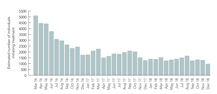 Figure 1. Estimated number of people initiating direct-acting antiviral treatment each month in Australia, 2016–2018